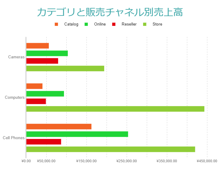 縦棒や横棒のチャートを使用して、データ値をサブカテゴリに分割することもできます。たとえば、「横棒」デモでは、商品カテゴリごとに各販売チャネルの純売上高を示します。