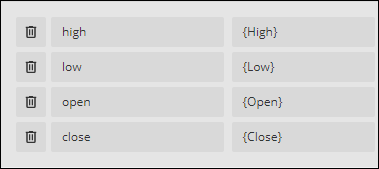 これらのプロットの値コレクションは、視覚化する価格情報を含むデータ値を決定します。値コレクションには、3つや4つのバインドされたフィールドの参照またはより高度なを持つValueプロパティが含まれます。これらの式には、高値、安値、始値、終値を構成するためにhigh、low、open、closeのラベルが含まれます。たとえば、「ローソク足」デモは、次のデータ値が設定されます。