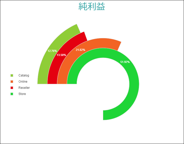 たとえば、「円形棒」デモでは、純利益における販売チャネルの貢献を示しています。