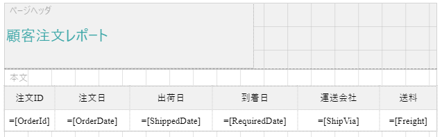 列がフィールドにバインドされたテーブルが作成されます。 詳細行の上のヘッダー行は、自動的にラベルが記入されます。