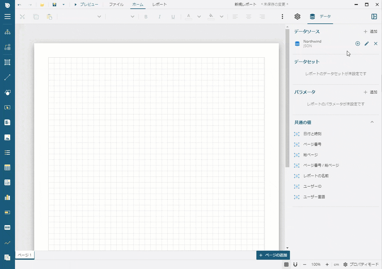 レポートとデータの接続を行うため、データ連結を行います。このチュートリアルでは、データソースとして「GrapeCity Data Service」のNorthWind Data Serviceを使用します。
