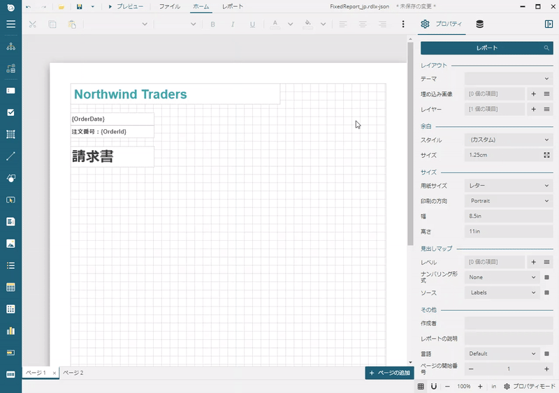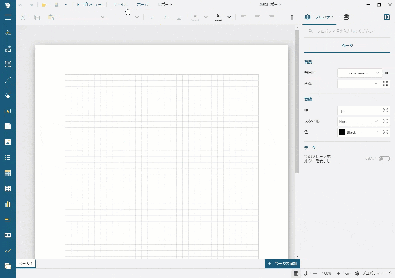 デザイナアプリでは、[ファイル]メニューをクリックし、[ページレポート]を選択して、新しいレポートを作成します。デザイン面の周囲にあるグレーの領域をクリックし、デザイン面の周囲にあるグレーの領域をクリックし、表示されるより、[余白]セクションの[スタイル]に「狭い」を設定し、余白を設定します。