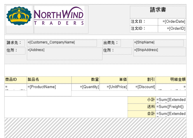 Container2に[Customers_CompanyName]、[Address]、[ShipName]、および[ShipAddress]のフィールドをドラッグ&ドロップします。これらのフィールドに対して、「請求先:」、「住所:」、「出荷先:」、および「住所:」のラベルを表示するためにテキストボックスを追加します。