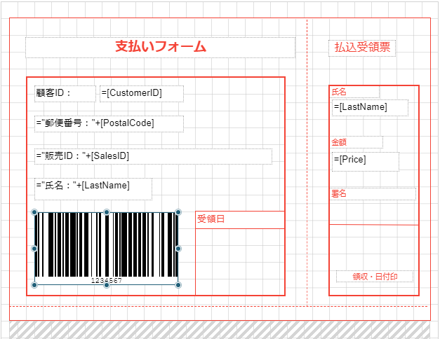 支払いフォームの下部にBarcodeコントロールをドラッグ&ドロップし、次のプロパティを設定します。