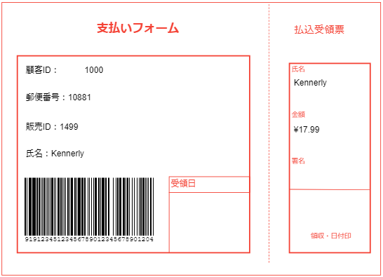 次の例では、バーコードが付いた払込取扱票を作成する方法を示します。このようなレポートは次のように表示されます。