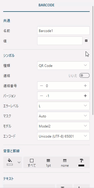 Barcodeで使用することができる主なプロパティを説明します。すべてのプロパティを表示するには、プロパティモードを[詳細プロパティを表示]にする必要があります。