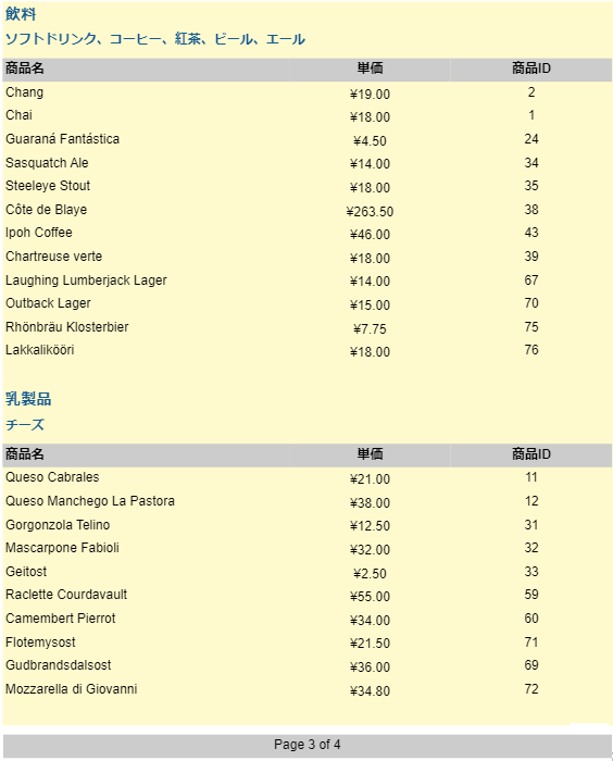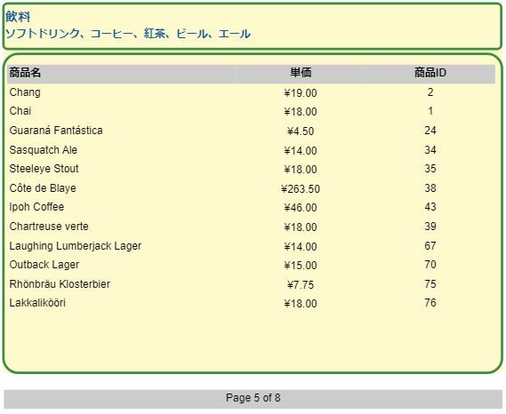 次は、カテゴリ別にグループ化された商品のカタログを表示するレポートが表示されています。このようなレポートを作成する方法については、Listを参照してください。