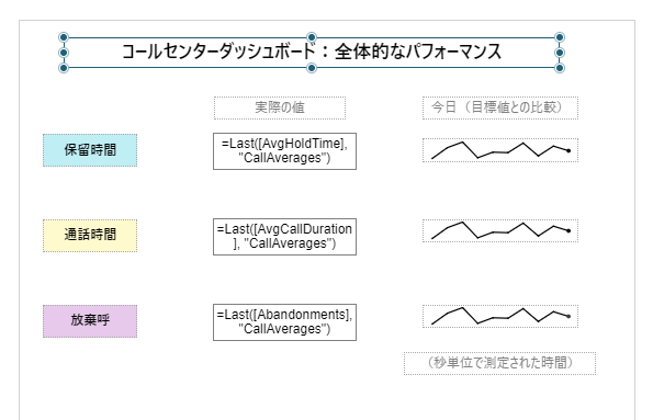 次の例では、目標値(秒単位で測定された時間)と比較してコールセンターのトレンドを視覚化する方法を示します。この例では、3つのSparklineコントロールを使用して、保留時間、通話時間、および放棄呼の3つの評価指標に応じてデータを表示します。