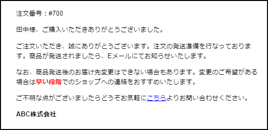 <p>なお、商品発送後のお届け先変更はできない場合もあります。変更のご希望がある場合は<span style="color:red;font-weight:bold">早い段階でのショップへの連絡をおすすめいたします。</span></p>