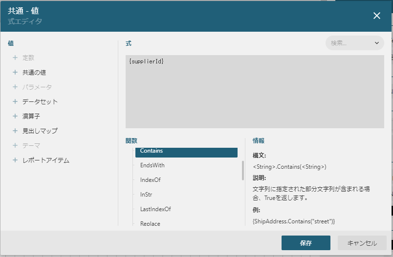 レポートコントロールのほぼすべてのプロパティについて、プロパティのドロップダウンリストから[]を選択することで[式エディタ]を表示することができます。 このダイアログでは、レポートやプロパティに設定したい式を一覧の中から選択することができます。
