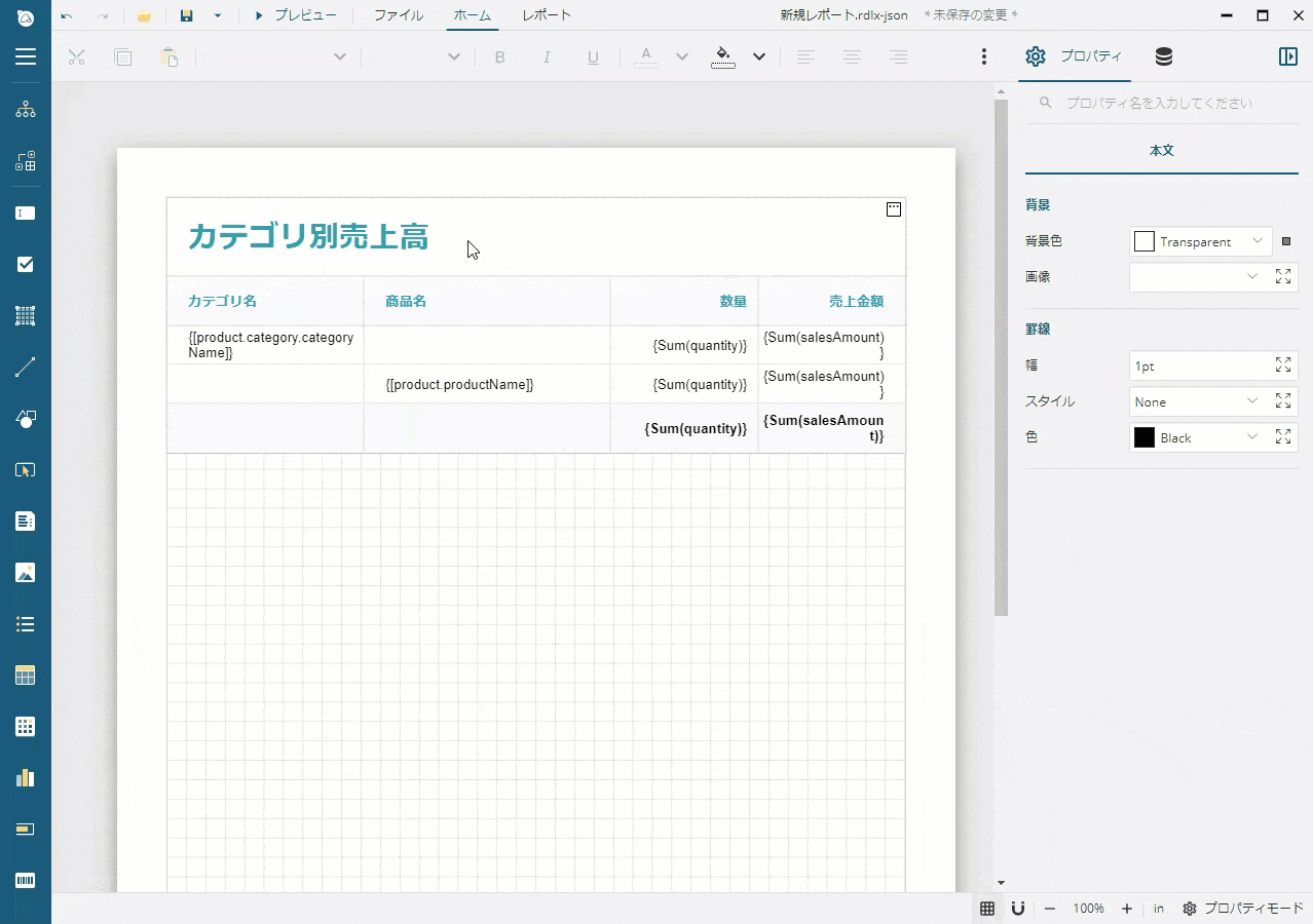 テーブルでは、最初の列に商品カテゴリ名、2番目の列に商品名、3番目の列に数量、4番目の列に売上金額を表示します。この情報に基づいて、列のプロパティを設定します。