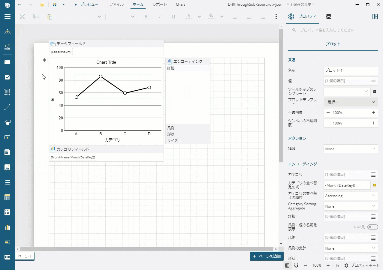 - [レポートに移動]の横にあるドロップダウンリストから「DrillThroughSubReport.rdlx-json」を選択します。