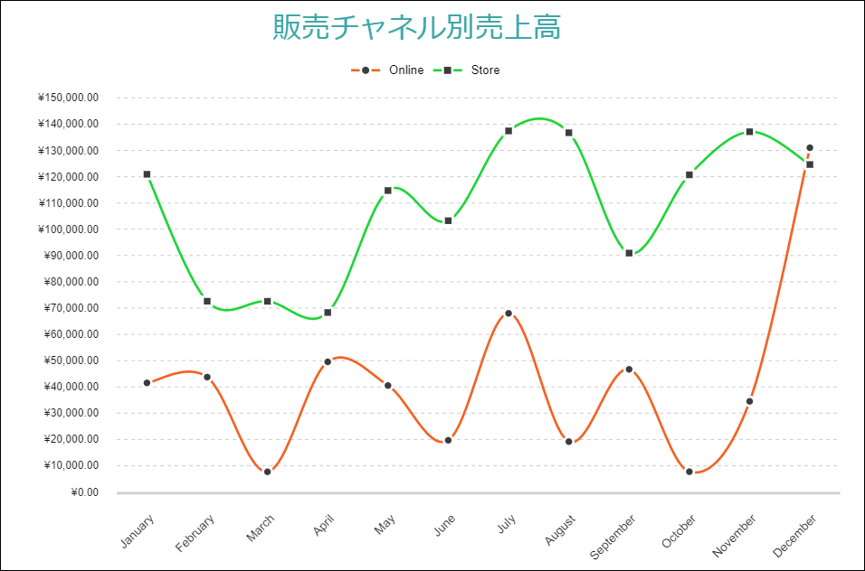 たとえば、「複数の折れ線」デモでは、「Online」および「Store」の販売チャネル毎に、1年間の商品の純売上高の変化を示します。