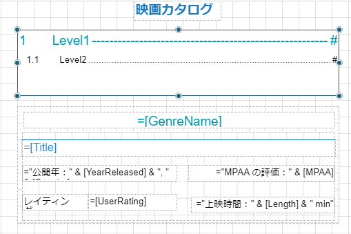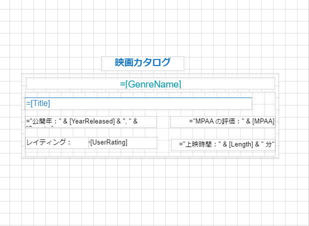 まず、レポートを作成します。このレポートでは、2つのListデータ領域、および映画の[公開年]、[MPAAの評価]、[レイティング]、[上映時間]を表示するいくつかのTextBoxコントロールを使用しています。また、ジャンルとタイトルで映画をグループ化するためにListデータ領域で式を使用しています。レポートのレイアウトは次のようになります。