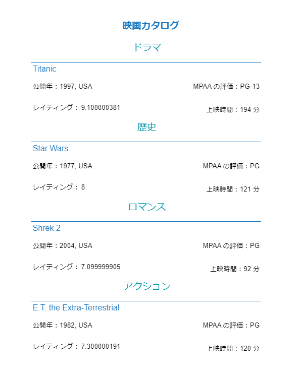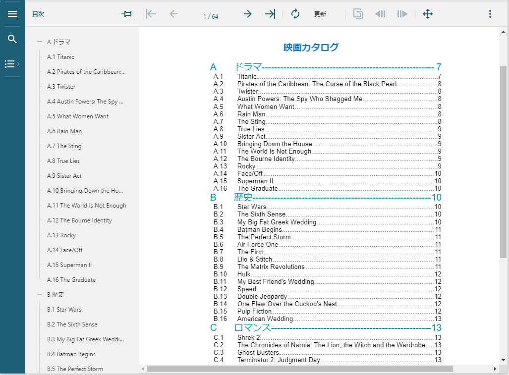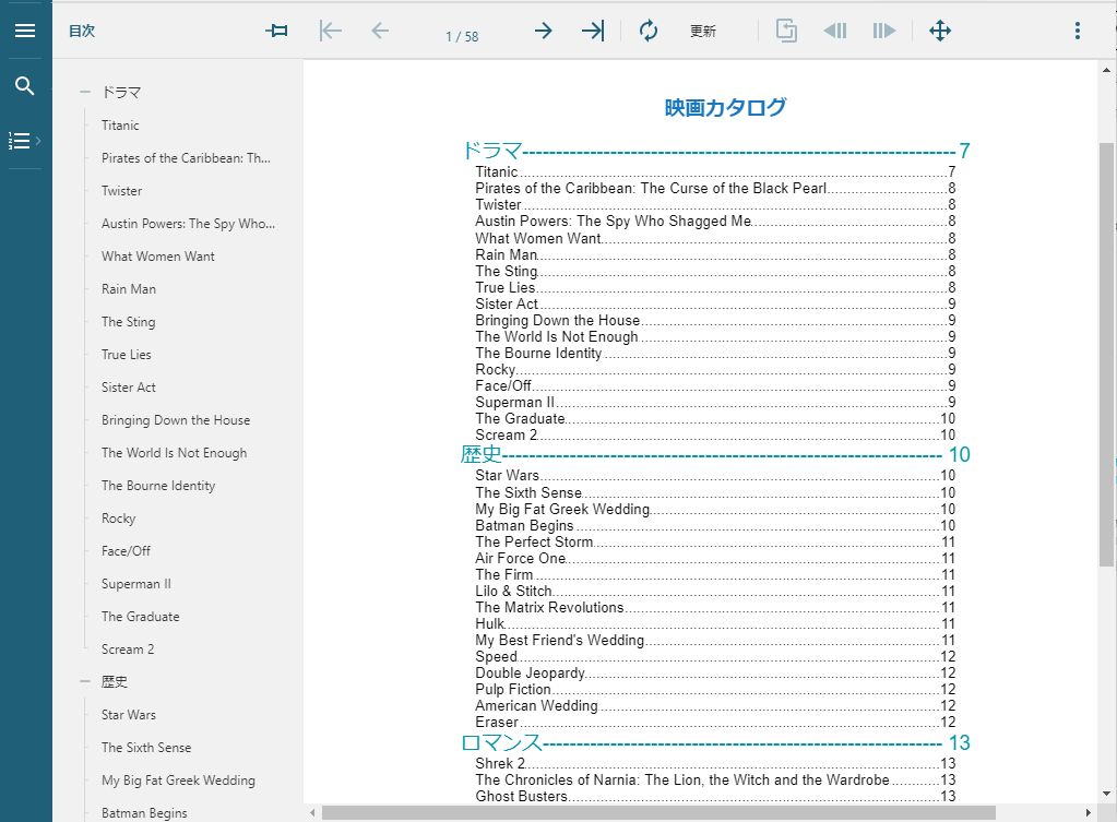 次の例では、公開年、レイティング、上映時間などの映画情報とともに映画を一覧表示する映画カタログ、および特定のジャンルに移動できるように目次リストを表示するレポートを作成する方法を示します。