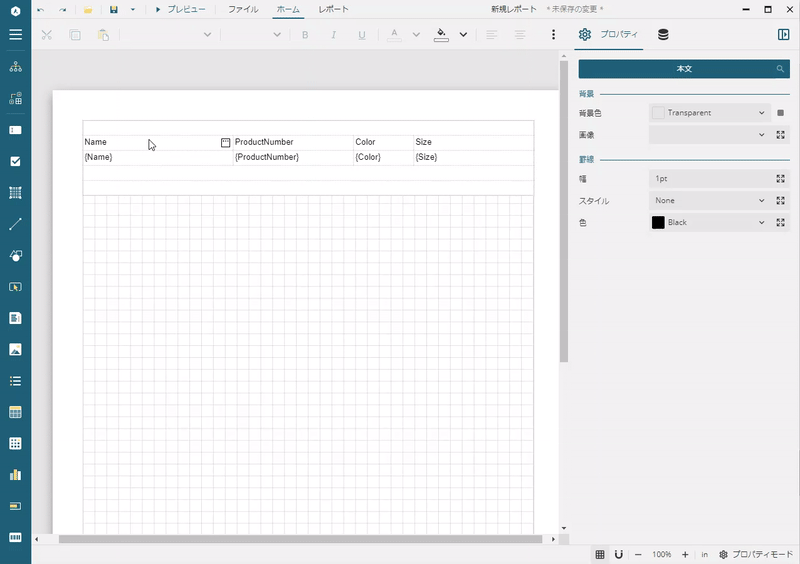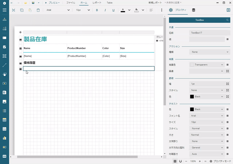 テーブルには2つの行かあります。以下の手順に従って、レポートのタイトルを表示するために1つのヘッダ行と製品の価格履歴を表示するために2つの詳細行を追加します。
