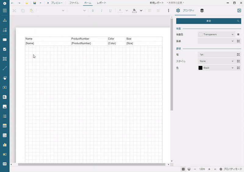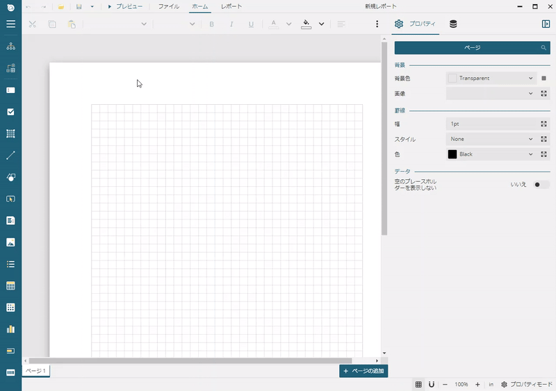 デザイナアプリにて、[ファイル]メニューをクリックし、[RDLレポート]を選択して、新しいレポートを作成します。デザイン面の周囲にあるグレーの領域をクリックし、表示されるより、[余白]セクションの[スタイル]に「狭い」を設定し、余白を設定します。