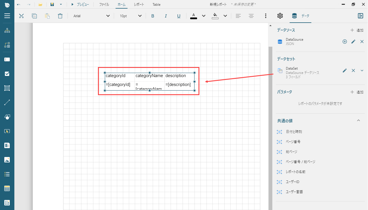 Tableデータ領域を使用して、データソースにあるカテゴリのリストを視覚化できます。テーブルを追加するために[DataSet]ノードを[データ]タブからレポート上にドラッグ&ドロップします。