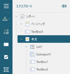 デザイナ面に配置した各コントロールの階層が次のようになっていることを確認してください。階層は、デザイナの左上にある[エクスプローラ]Report Explorer Iconをクリックすると表示することができます。