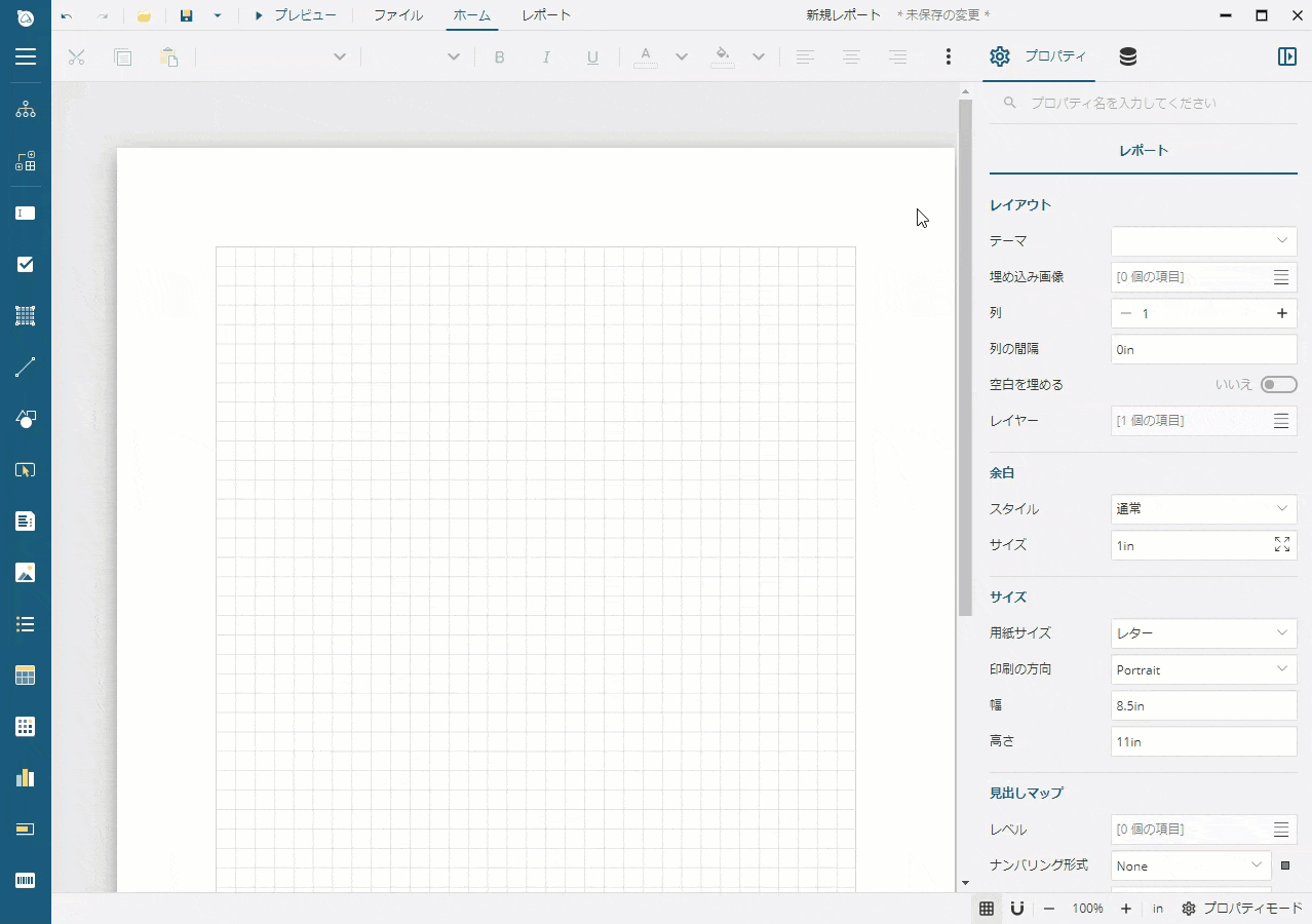 デザイナアプリにて、[ファイル]メニューをクリックし、[RDLレポート]を選択して、新しいレポートを作成します。デザイン面の周囲にあるグレーの領域をクリックし、表示されるより、[余白]セクションの[スタイル]「狭い」を設定し、余白を設定します。